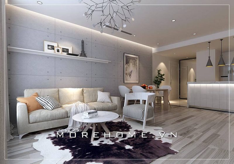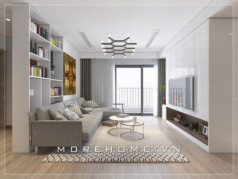 Không gian phòng khách căn hộ chung cư hiện đại vừa thoáng đãng vừa tiện lợi, gần gũi với tâm điểm là bộ sofa góc bọc vải màu xám tinh tế.