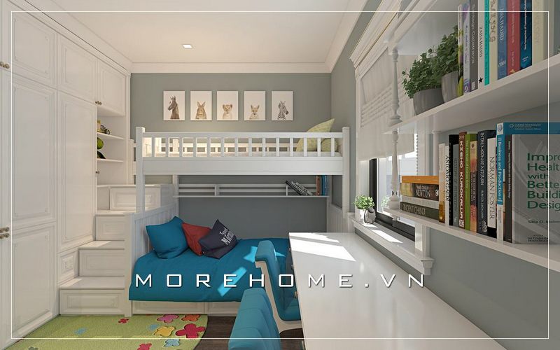 Kệ trang trí phòng ngủ với nhiều ngăn giúp góc học tập của con được tiện lợi hơn