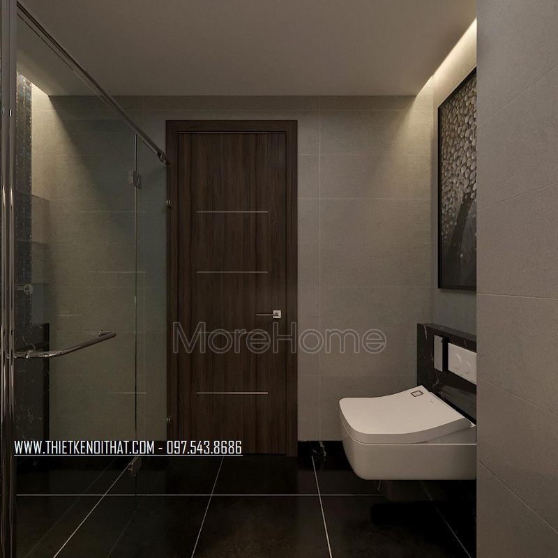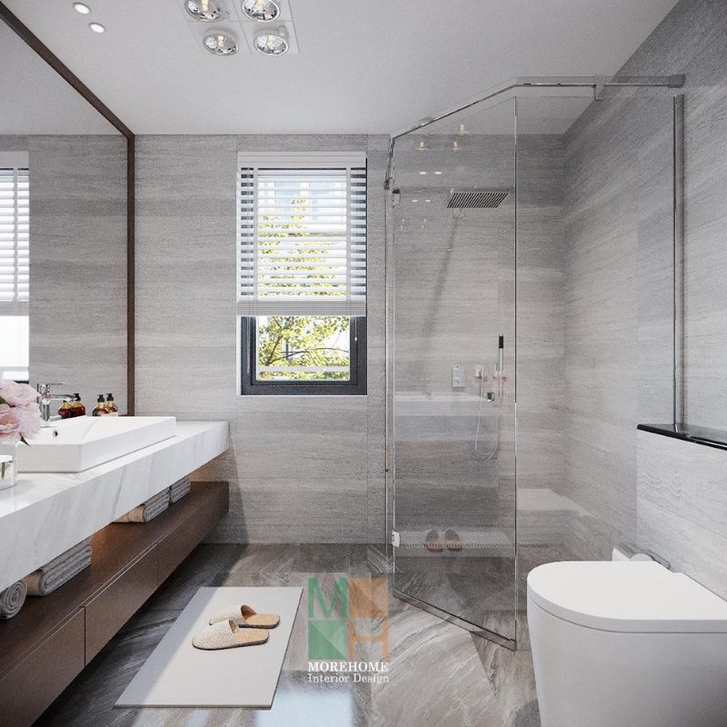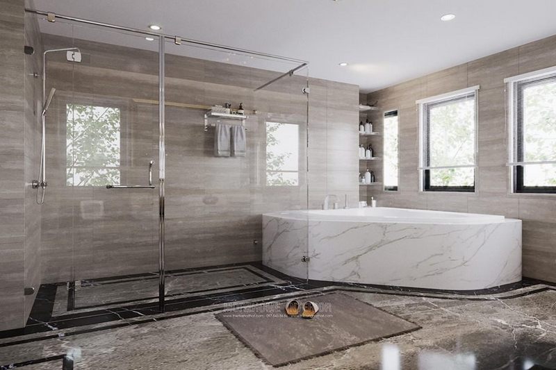 Thiết kế thông minh giữa nhà tắm và nhà vệ sinh liền kề nhưng được ngăn cách bằng kính cường lực trong suốt giúp căn phòng trở nên sang trọng và tiện nghi hơn.