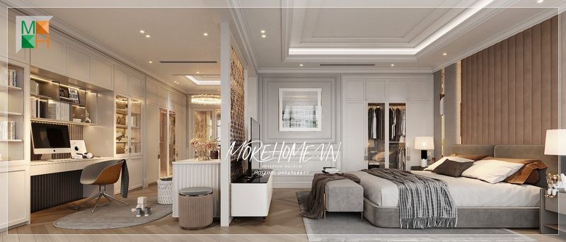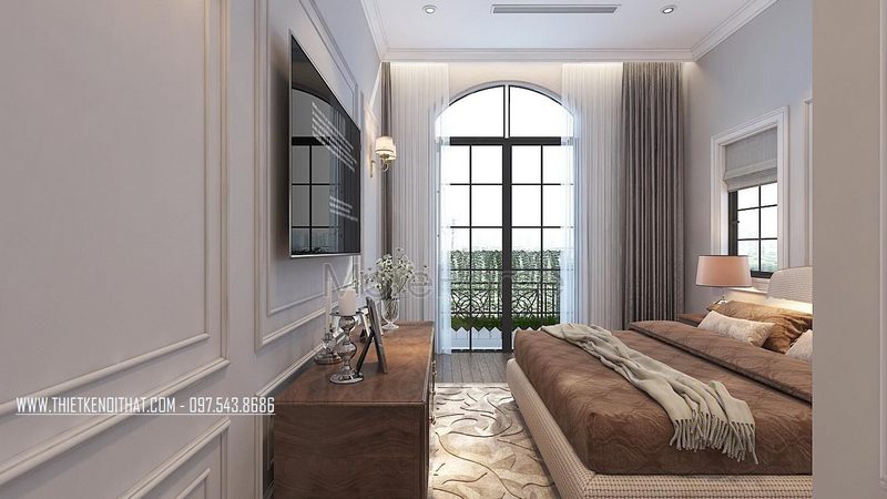 Toàn bộ nội thất trong căn phòng đều được lựa chọn với chất liệu gỗ tự nhiên phun sơn trắng cao cấp, mang lại không gian phòng ngủ Master đầy sang trọng và tinh tế