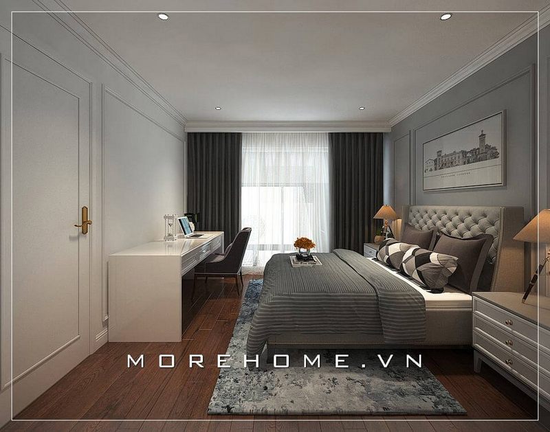 Nội thất phòng ngủ chung cư nhỏ đầy ấn tượng, chiếc giường ngủ màu trắng mang phong cách tân cổ điển nhẹ nhàng, liền kề là khu vực làm việc mang lại sự thuận tiện hơn