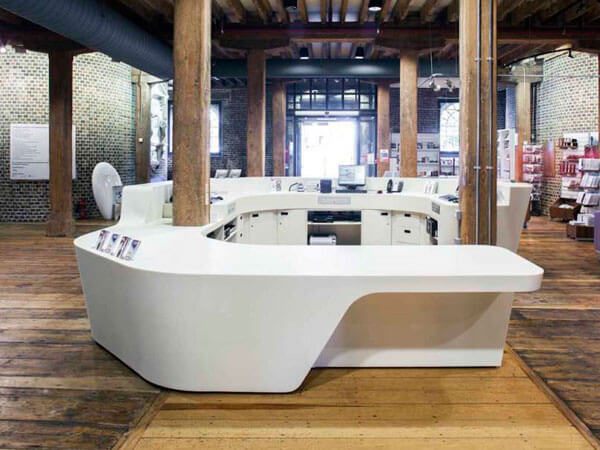 Quầy lễ tân đá nhân tạo lựa chọn kiểu dáng lựa chọn theo ý muốn phù hợp với diện tích đem lại thẩm mỹ cho không gian.