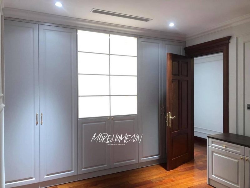Phòng thay đồ master được thiết kế với hệ thống tủ quần áo kịch trần cánh kính bằng gỗ tự nhiên sơn trắng phong cách đương đại