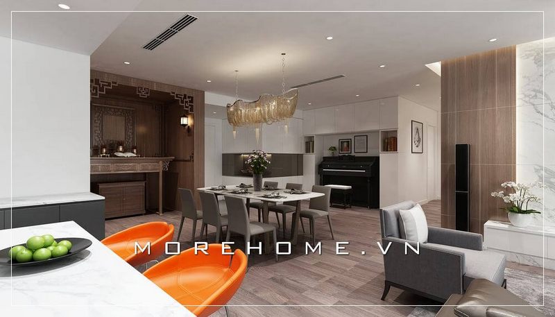 Mẫu thiết kế chung cư đẹp với sự kết hợp hài hòa giữa nội thất gỗ tự nhiên và gỗ công nghiệp tông màu trẻ trung.